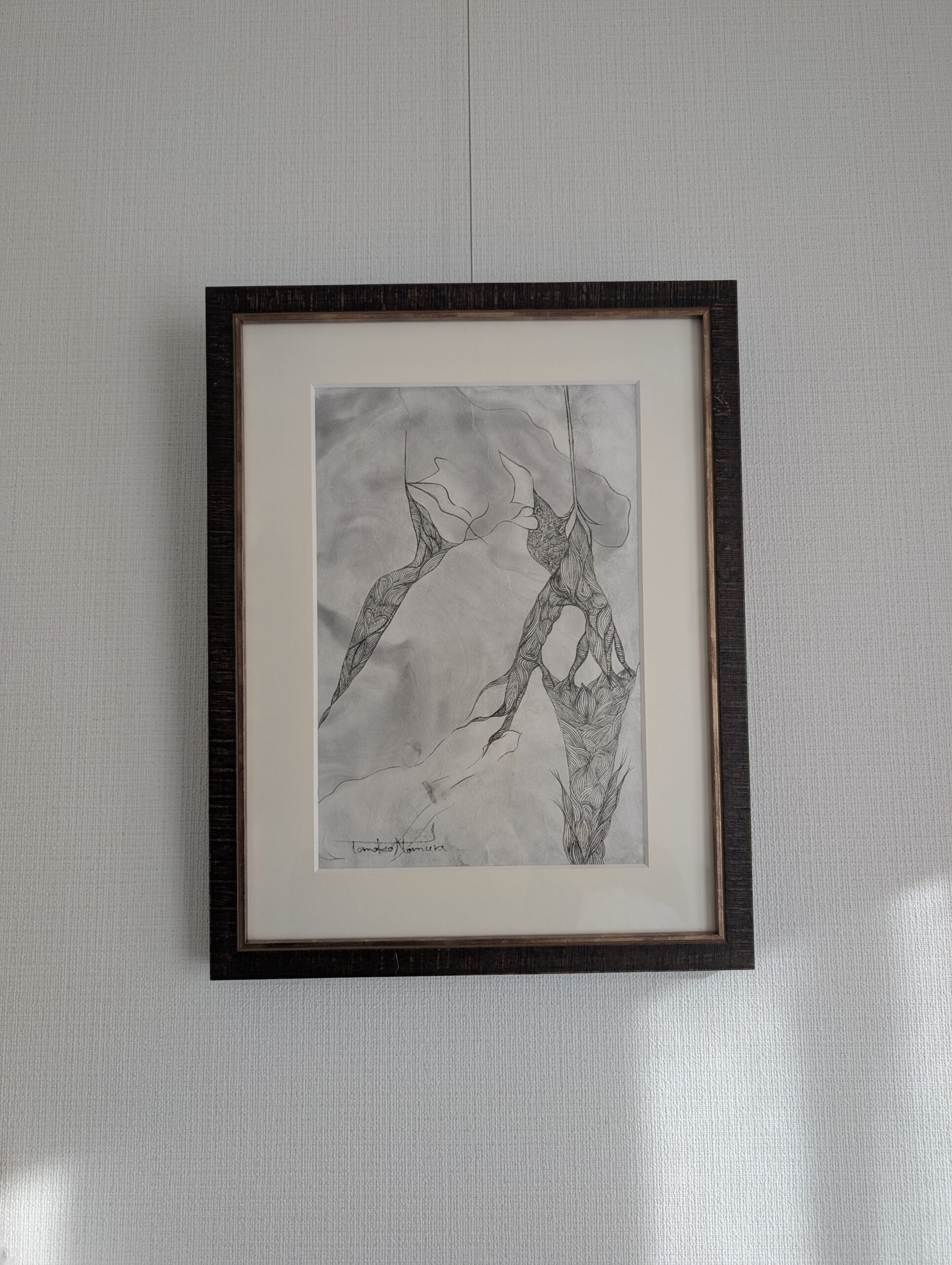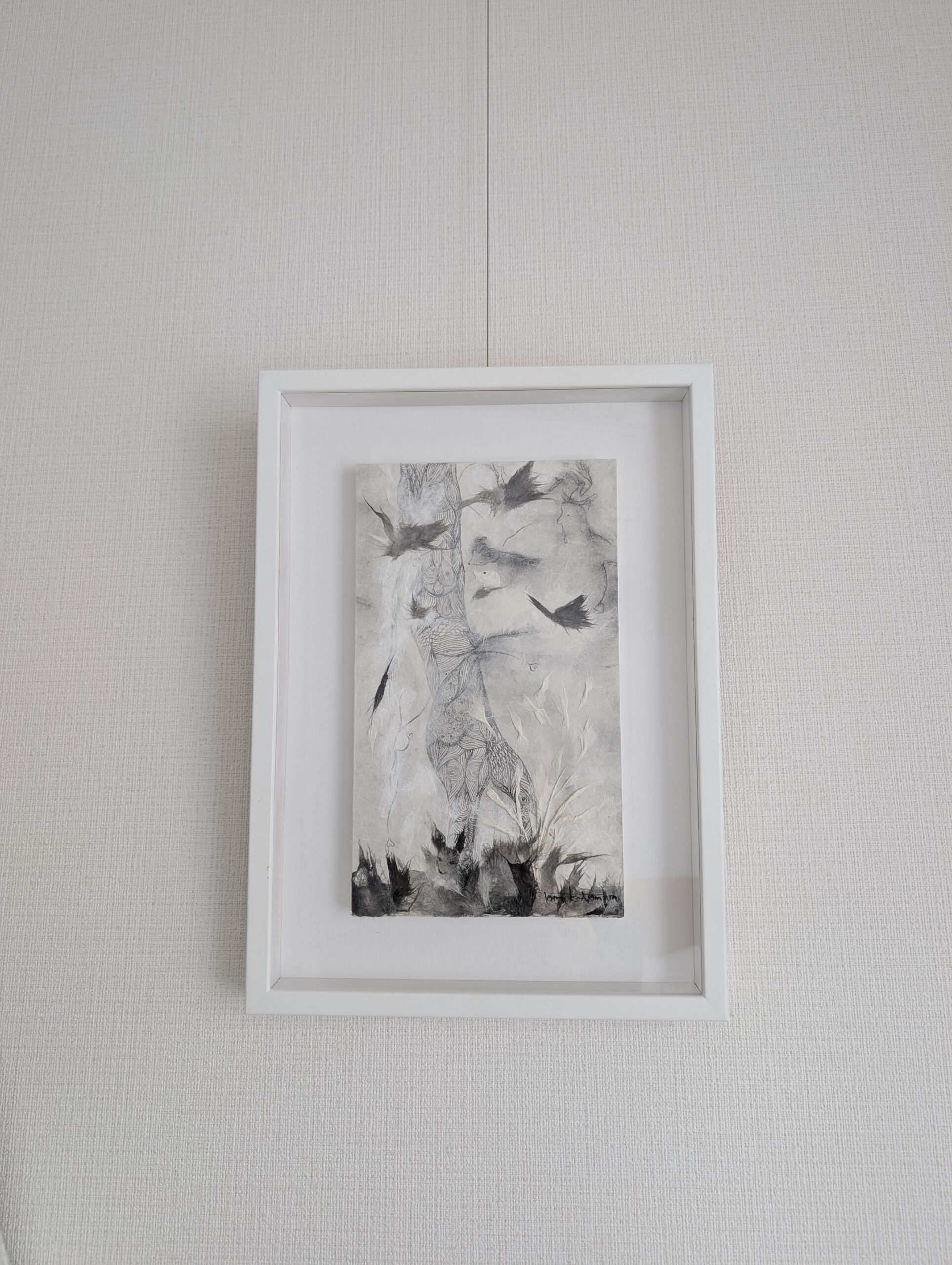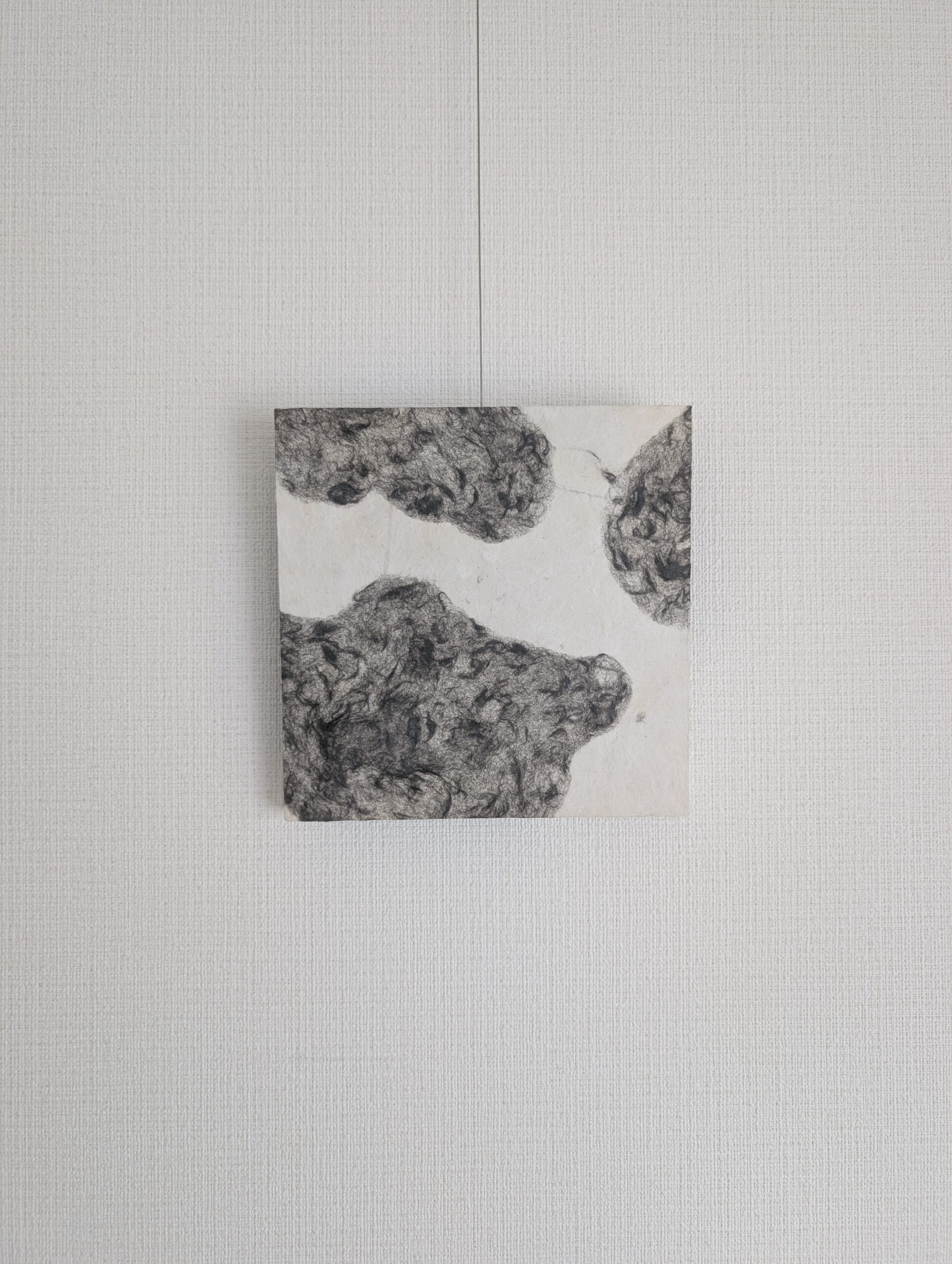 野村朋子の創作は【和紙作り(紙漉き)】から始まります。1653年江戸時代から続く小津和紙の体験工房を貸切らせて頂き、創作の第一歩である「紙漉き」を行います。紙の原料となる楮とトロロアオイが入った漉き舟の中で繊維を重ねながら、先ずは「森羅万象の基」をつくります。次に、自作の創作手漉和紙に墨流し。墨流しを裏にして、「面相筆」と「墨」で森羅万象の世界を描いてゆきます。墨の世界を描く時はいつも「空(くう)」の状態に自分を整え、手漉和紙と墨流しからインスピレーションを頂き感じるままに筆を運びます。そこからは「ここにいるよ」の声に耳を傾け画面との対話が始まります。線画の上にまた薄い手漉き和紙を貼り重ね、また筆を入れ、和紙を重ねる。手漉き和紙に墨をふくませ千切り、2晩寝かせ、濃淡の美しさを感じたら、また画面に仲間入りさせる。という地道な創作で、M3号の小さな画面でも1ヶ月半、160㎝の大きな作品になると半年以上、完成までに時間がかかる作品たちです。
