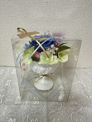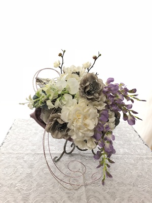 In addition to artificial flowers, she incorporates traditional crafts such as silk textiles and mizuhiki, expressing the theme of “harmony between East and West.”