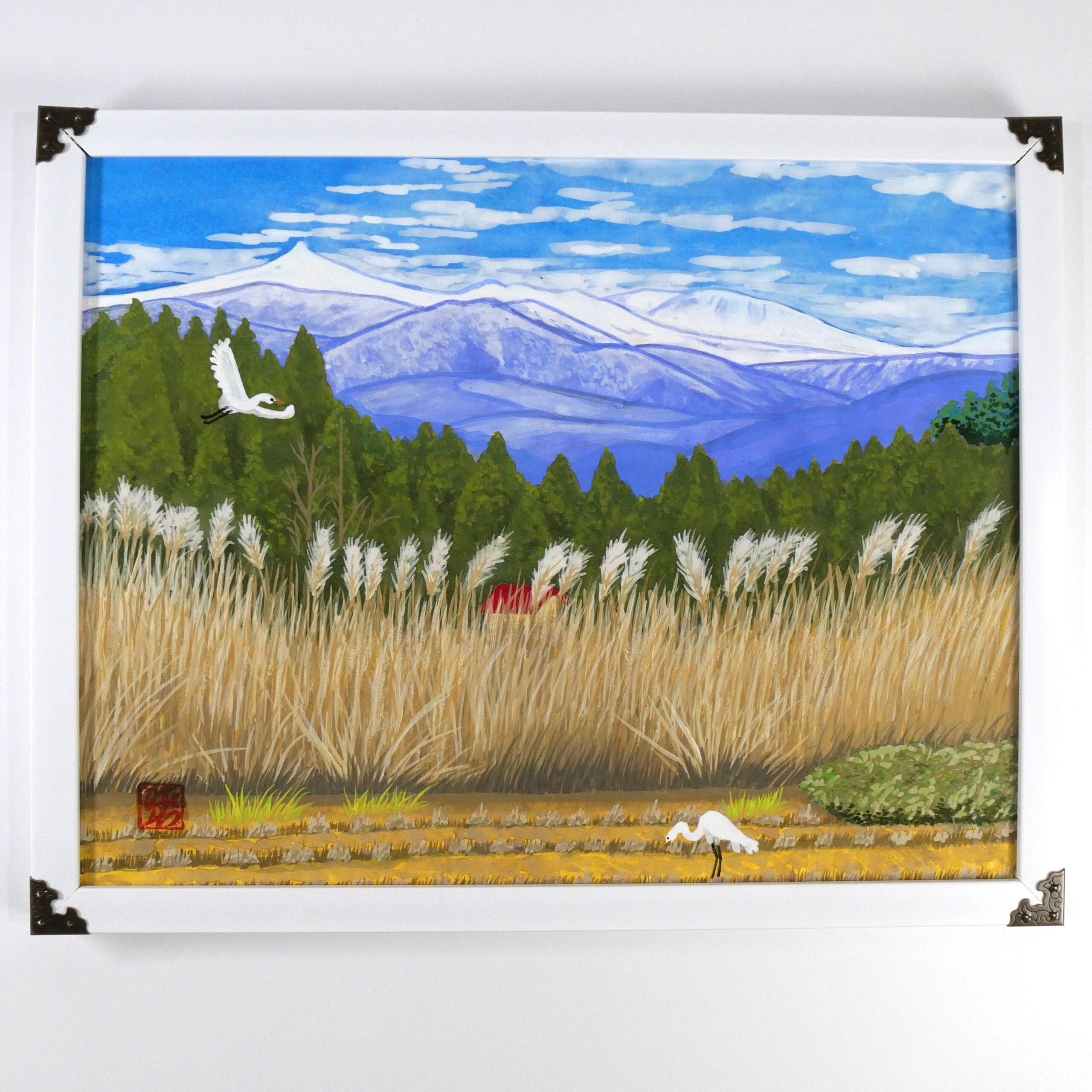 主題は主に風景や花ですが、鷺や蝶を好んで描き、象徴的な存在として画面に登場させています。それらは自然の移ろいと生命の気配を結ぶ媒介であり、私自身の視線の在り処でもあります。