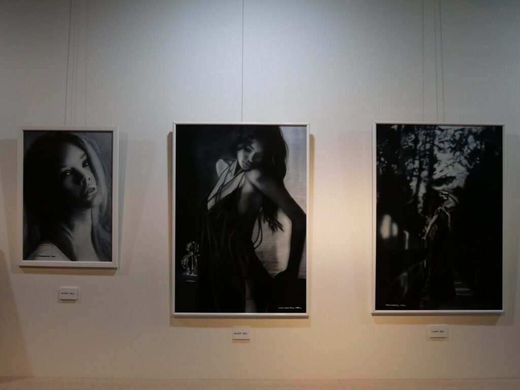 制作には0.3ミリのエアブラシを使用し、白と黒のみで繊細な濃淡を描き分けています。限られた色彩の中で陰影を重ねることで、立体感や空気感を表現しています。